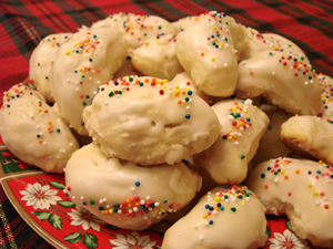 We set up an assembly line for frosting and sprinkling with non pareils. Many hands make light work. As you can see it makes sense to get everyone involved in this baking project. God bless you and the fruits of your labor. At our house we call these the “Jesus, Mary and Joseph cookies” because as we snip we bless each cookie with the memory of the Holy Family in the hope that we can nourish each other and live up to their example. Enjoy! – Annie Kachurek